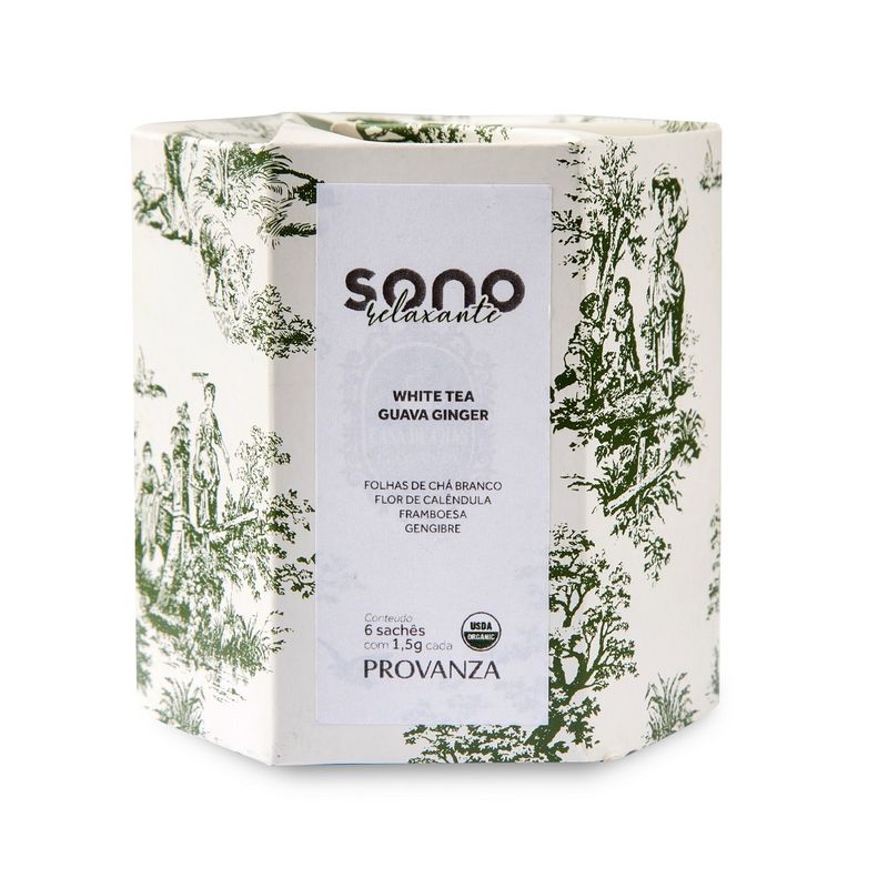O Chá Sono Relaxante Provanza (White Tea Guava Ginger) tem um aroma agradável, rico e proporciona um sabor exótico e tropical. Pode ser preparado quente ou gelado. Não contém glúten.