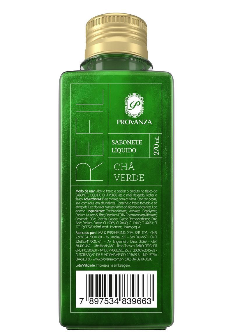 Abrir o frasco do refil e colocar o produto no frasco do Sabonete Líquido Chá Verde Provanza até o nível desejado. Fechar o frasco. Para utilizar, aplicar sobre a pele úmida e massagear até obter uma espuma abundante. Enxaguar em seguida.